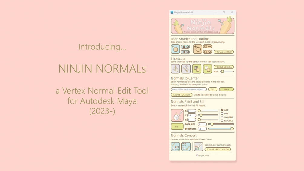 Introducing Ninjin Normals, my new Autodesk Maya script that lets you manipulate vertex normals to create stunning toon-shaded and stylized renders. With its cute UI and charming color scheme, Ninjin Normals is the perfect tool for any 3D artist looking to get extra control of their work.